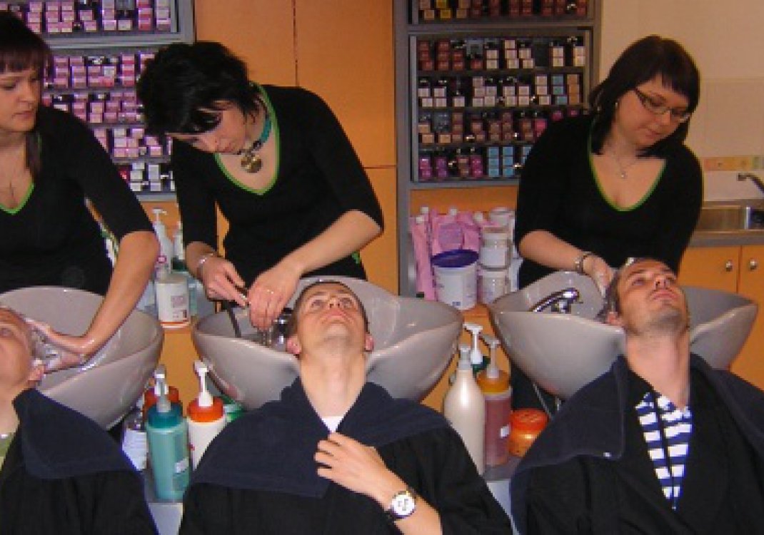 K mytí vlasů ještě před samotným stříháním přistoupili zleva Pavel Mezlík, Michal Šmíd a Jan Svátek.
