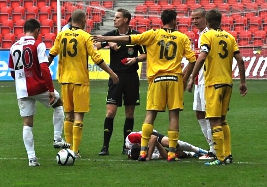 Jihočeši začali zápas v pražském Edenu dobře a v průběhu prvního poločasu byli domácímu celku naprosto vyrovnaným soupeřem. "Situace pro nás je teď špatná. My jsme na Slavii jeli ale s tím, že chceme bojovat a uhrát nějaký bod. Myslím, že v prvním poločase jsme hráli dobře, Slavii jsme k ničemu nepustili a byl to vyrovnaný zápas. Pak ale přišla ta červená karta a v deseti to už nešlo," řekl David Horejš, který jen velmi těžko nesl rozhodnutí rozhodčího Jecha: "Myslím, že přímo na červenou kartu to asi nebylo. Už předtím byly ze strany Slavie stejné zákroky, a ty byly potrestané žlutou kartou. Určitě jsem byl hodně překvapený, že rozhodčí vytáhl rovnou červenou kartu. Celý druhý poločas o deseti pak byl pro kluky už hodně těžký."