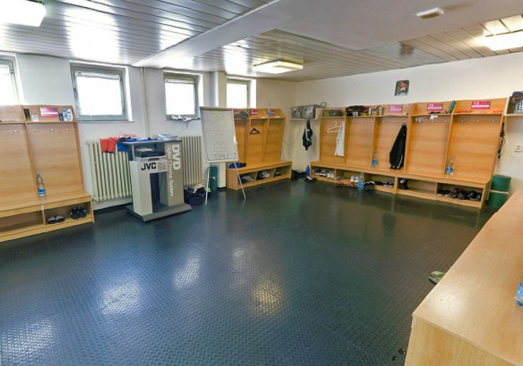 Pohled do kabiny A-týmu Dynama České Budějovice. Vidět je společenská místnost a také samotná šatna hráčů.