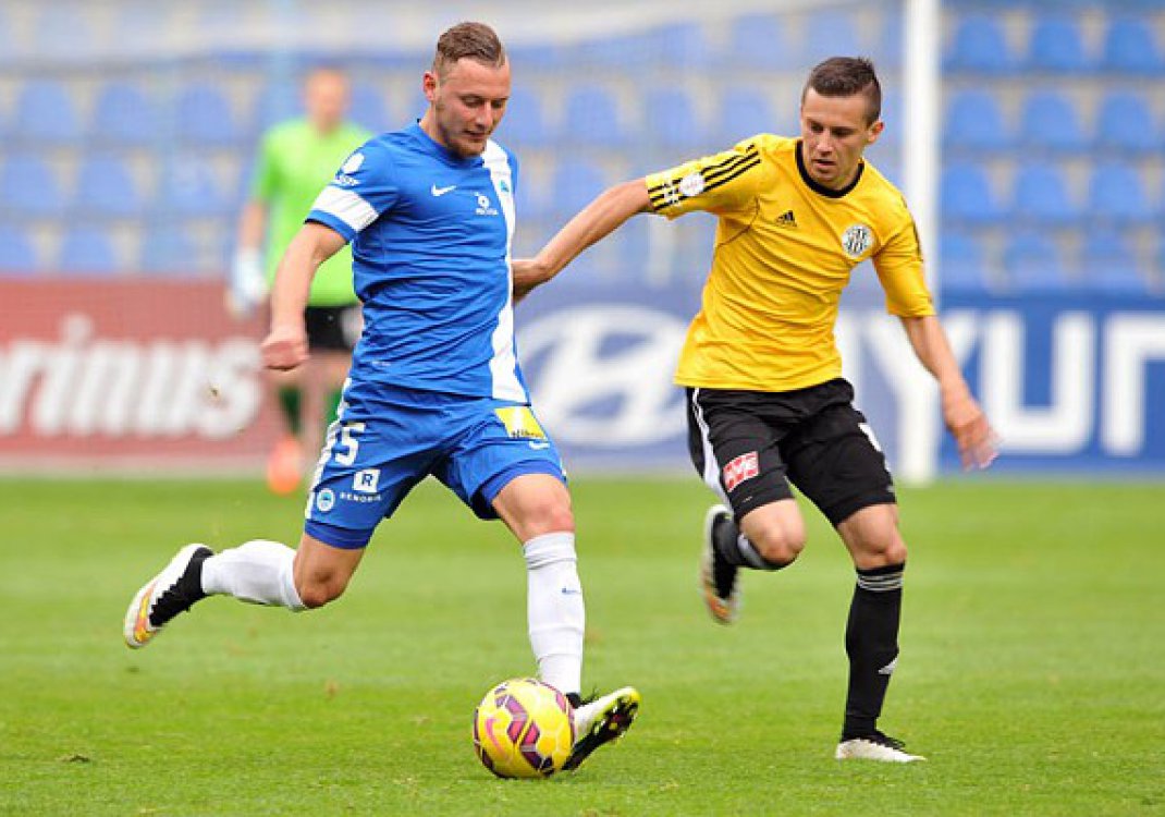 V základní sestavě Jihočechů se objevil Dvořák, na levý kraj obrany se posunul Janotka. V záloze hrál zprava Řezáč, místo zraněného Fundy šel doleva Pešek. Úvod patřil spíše domácím, kteří měli míč častěji na svých kopačkách, ale nebezpeční nebyli. První šance přišla až po čtvrthodině hry, kdy Frýdkův centr nenápadným obloučkem skoro dostal za Křížka pohotový Bakoš, ale českobudějovický gólman si poradil. Do vedení tak šli po půlhodině hry Jihočeši. Dlouhý míč nechtěně prodloužil za sebe Pokorný, míče se chopil Michal Řezáč, obešel brankáře Lukáče, mazácky si položil Fleišmana a do prázdné branky pohodlně vsítil svůj první ligový gól.