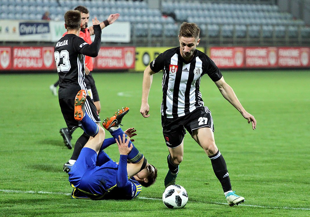 Domácí v první půli dominovali a vytvářeli si jednu šanci za druhou. Jednu z největších spálil David Ledecký, který hlavičkoval sám na malém vápně, ale trestuhodně minul. Další střelecké pokusy měli krajní záložníci Wermke a Mršič, ale ani jeden z nich netrefili branku soupeře. Jihlava směrem dopředu udělala snad jedinou akci, která skončila ofsajdem.