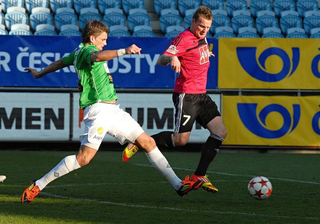 Baumit zahrozil po kombinaci Pitáka s Kopicem, ale mladý reprezentant nahrál volnému Třešňákovi nepřesně. Po půlhodině hry utekl míč při rozehrávce Řepkovi, následně fauloval Pitáka a rozhodčí Hrubeš mu udělil žlutou kartu, i když domácí stoper reklamoval, že soupeř padal až moc ochotně. V zápětí se při rozehrávce nedomluvili Riegel s Rýdelem, z čehož těžil Jarolím, ale Delač jeho střelu zlikvidoval.